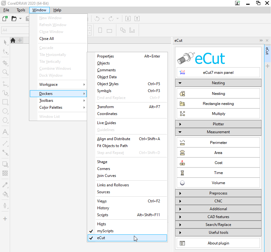 [Nesting][Cut/Plot + contour cutting][Perimeter][Area][Cost][Time][Weeding lines][Multiply][Rectangle nesting][LEDs][Neon][Draft][Central line][Smart divide][Connect opened paths][Fillet][Find intersections][Find duplicates][Search shapes][Create SignBox][Create lines][Create grid][Create cropmarks][Reduce nodes][Effects][Edge roll][Contour cutting file][Separate curve][Remove duplicated edges][Slice object][Eyelets][Create carrier (boundbox)][Align and Distribute][Set size][CAD functions][DXF Export][Replace][Reference scale][Create bridges][Variable][Hotwire cutting][Route optimizer][Finger joint box][Finger joint shape][Volume calculator][Door panels][G codes][Liquid acrylic][Scripts][Finger joint change size]